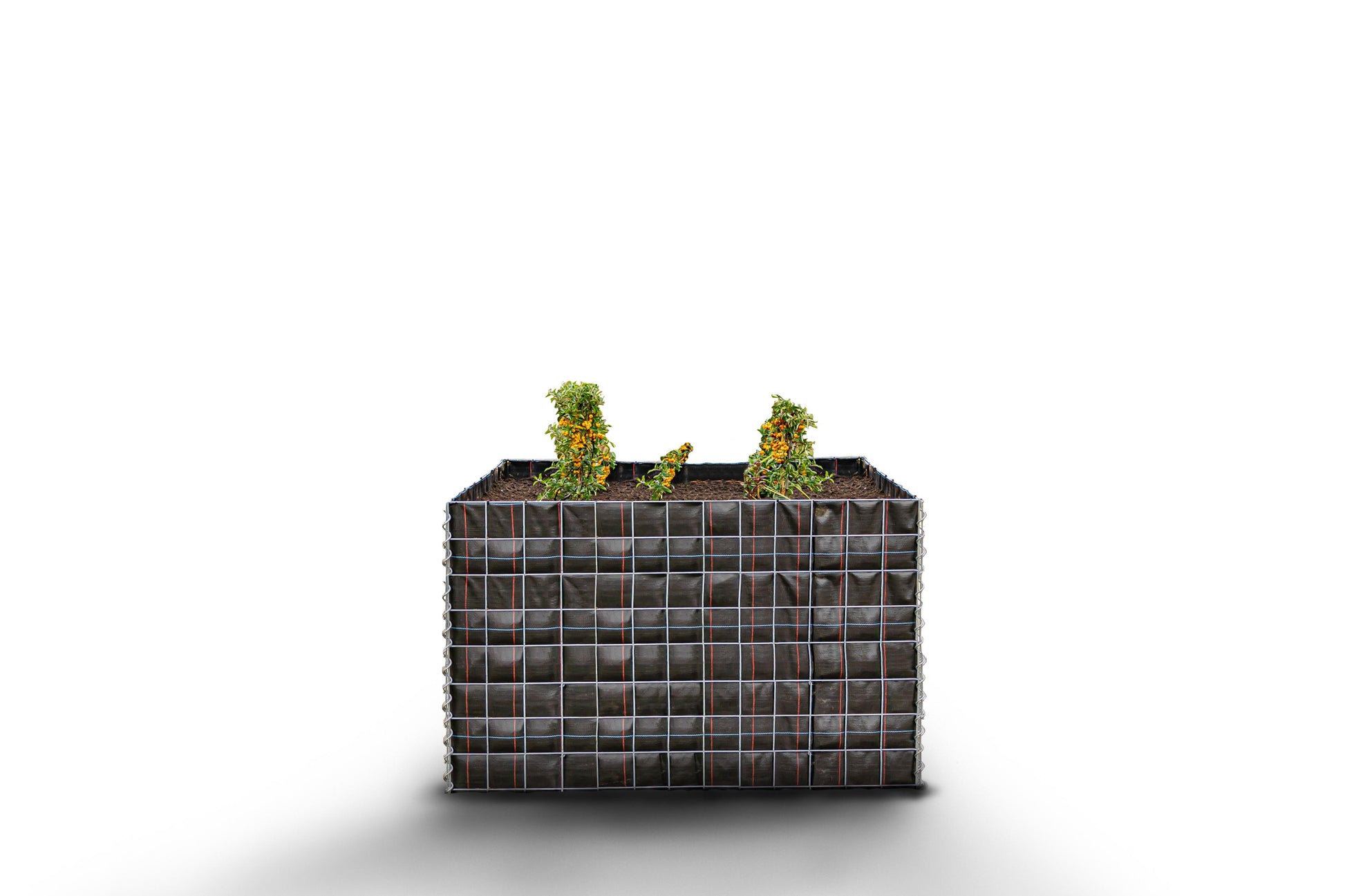 Den här kantiga gabionhögen erbjuder en modern och funktionell lösning för din trädgård - utan extern stenfyllning. Gitterkonstruktionen är på insidan fodrad med en robust fleece som håller jorden säkert på plats. Fleecen är synlig på utsidan, men kan anpassas eller döljas.